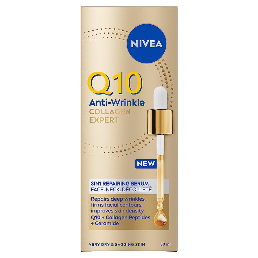 Q10 Anti-Wrinkle Collagen Expert 3IN1 Repairing Serum, der reparerer dybe rynker, opstrammer og forbedrer hudens elasticitet.
