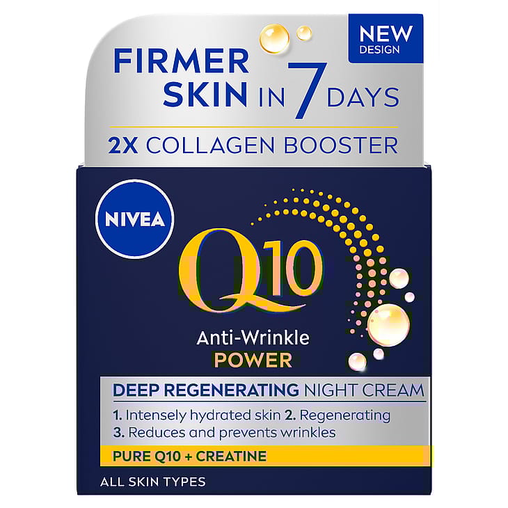 NIVEA Q10 Power Replenishing Night Cream er en rig natcreme, der nærer og fugter huden intenst og giver en øjeblikkelig blød og glat fornemmelse. Cremen indeholder dobbelt kollagenbooster med ren Q10 og kreatin samt hyaluronsyre. Q10 booster hudens kollagen og korrigerer rynker indefra (testet på hudceller). Kreatin er kendt for at give øjeblikkelig energi til hudcellerne og et ekstra boost til kollagenproduktionen og elastin (testet på hudceller).