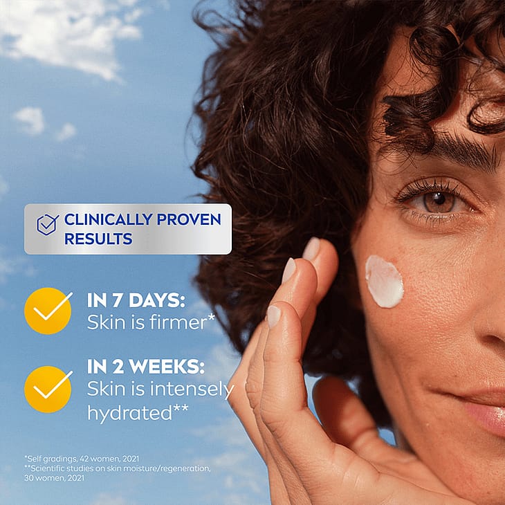 Hyaluronsyre giver fylde og binder fugt i huden. Oplev denne NIVEA-natcreme med klinisk dokumenterede resultater: reducerer rynker for 86 % af kvinderne på 7 dage og fastere hud for 76 % af kvinderne på 7 dage (selvevaluering, 42 kvinder, 2021). Derudover intensivt fugtet hud for 90 % af kvinderne på 2 uger og regenereret hud for 73 % af kvinderne på 4 uger (videnskabelige undersøgelser af hudens hydrering/regenerering, 30 kvinder, 2021). Denne natcreme er dermatologisk testet og velegnet til alle hudtyper.