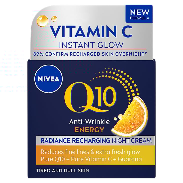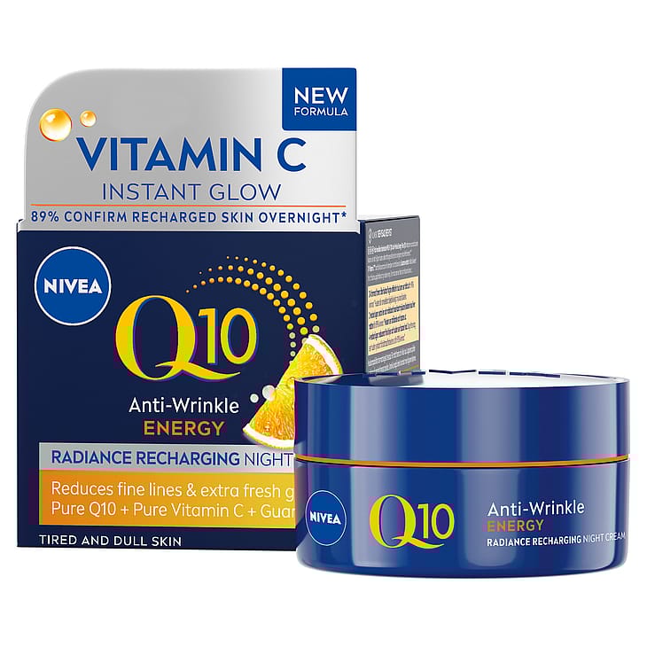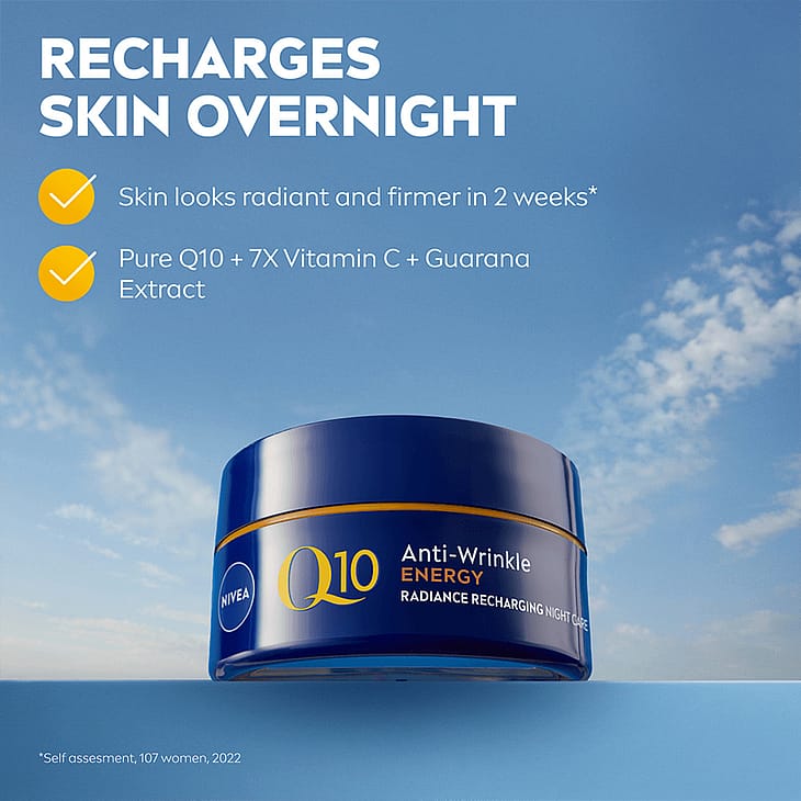 NIVEA Q10 Energy Recharging Night Cream er en natcreme, der giver din hud en sund glød. Formlen er beriget med tre antioxidanter: C-vitamin, E-vitamin og Q10 og forbedrer hudens fugtbalance og styrker hudbarrieren i løbet af natten. Ansigtscremen modvirker tegn på stress som fine linjer og træthed, og virker opstrammende. Få en fastere og glattere hud med mere udstråling. Velegnet til normal til tør hud. Dermatologisk testet.
