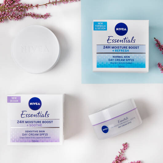 NIVEA Essentials linje er udviklet til alderen 15+ år med fokus på fugt og pleje til den unge hud. Serien er både udviklet til tør hud, normal hud og sensitiv hud, der sørger for at din hud bliver plejet efter dens behov. Dagcremerne kan fås med SPF15.