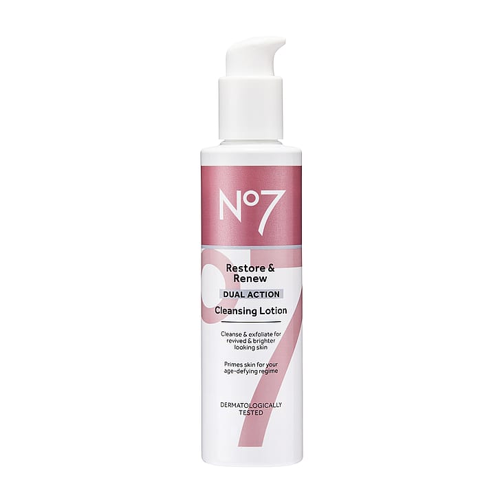 Restore & Renew Dual Action Cleansing Lotion er et eksfolierende renseprodukt, der får huden til at se mere frisk ud med fornyet glød.