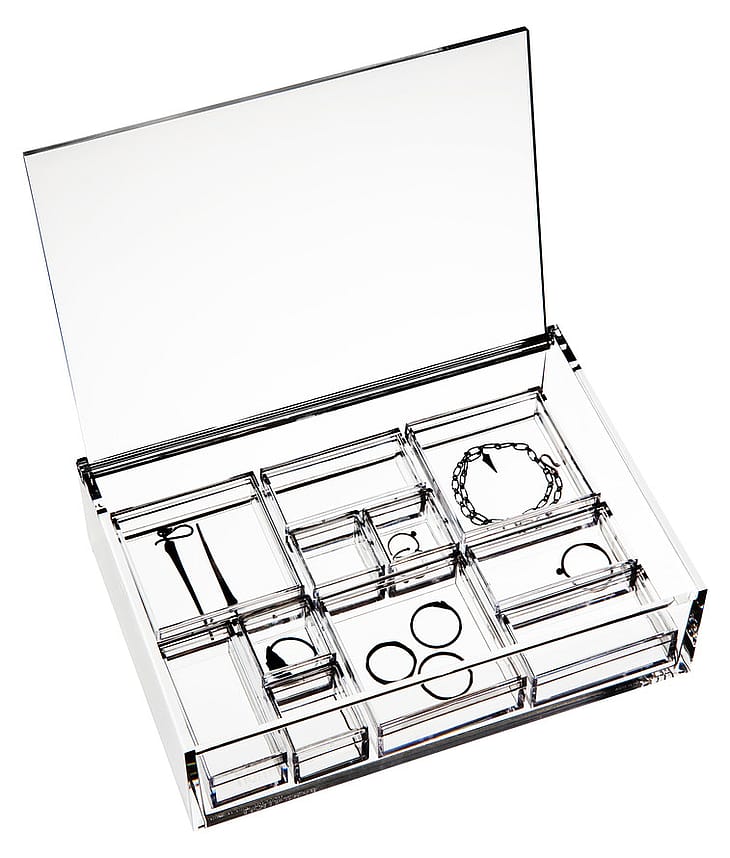 Smykkeskrinet er halvt fyldt med klare æsker, som ligger i ét lag.