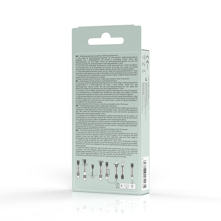 Sættet indeholder en testkassette, et prøveopsamlingsrør med ekstraheringspuffer, afføringsopsamler, samt en detaljeret brugervejledning, som trin for trin guider dig gennem processen. Testen indeholder ikke en prøvebeholder, eller en timer. En prøvebeholder kan eksempelvis være et toilet, og en timer kan være et ur, eller en telefon. Testen kræver ingen specielle forberedelser eller kostrestriktioner, hvilket gør den nem at anvende.