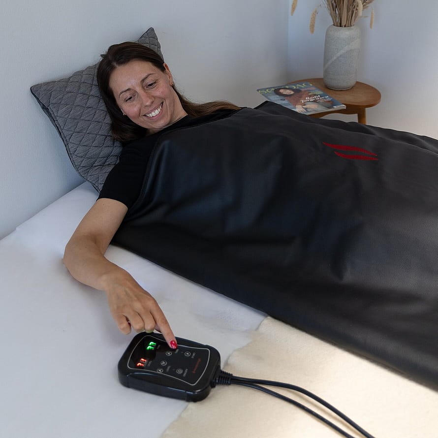 Du lægger dig i saunatæppet, indstiller temperatur og tid og slapper af, mens varmen arbejder.