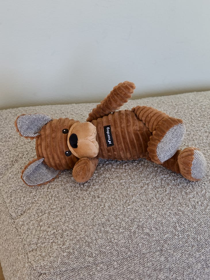 Tyson er en blød polyester bamse, der kan genkendes på den flotte brune farve og de strittende øre med tern, og så har han altid et stort smil på læberne. En blød hundebamse, der med indbygget pivedyr altid er frisk på sjov og ballade.