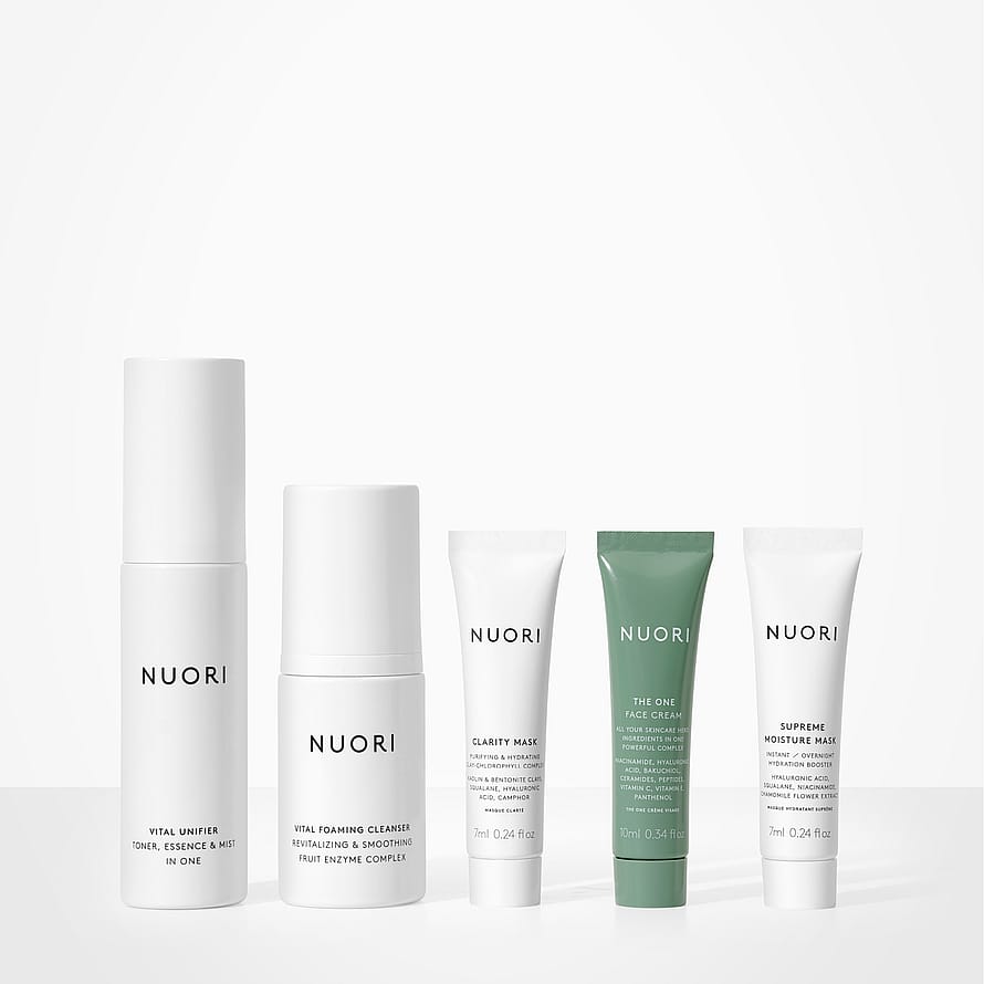 Vital Foaming Cleanser Glycerin¹, Aqua (Water), Cocamidopropyl Betaine¹, ?Betaine¹, ?Avena Sativa (Oat) Kernel Extract, Triethyl Citrate, ?Lactobacillus / Punica Granatum (Pomegranate) Fruit Ferment Extract, Leuconostoc / Radish Root Ferment Filtrate, Citrus Sinensis (Sweet Orange) Peel Oil Expressed, Citrus Limon (Lemon) Peel Oil, Parfum (Fragrance)², Limonene², Sodium Gluconate, Citric Acid, Potassium Sorbate. ¹ Plant Origin / ² From 100% Natural Essential Oils. Vital Unifier Aqua (Water), Aloe Barbadensis (Aloe Vera) Leaf Juice, 1.3 Propanediol1, Pentylene Glycol1, Pyrus Malus (Apple) Fruit Water, Gluconolactone, Maltodextrin, Polyglyceryl-4 Caprate, Sodium Gluconate, Chamomilla Recutita (Chamomile) Flower Extract, Camellia Sinensis (White Tea) Leaf Extract, Sodium Hyaluronate (Hyaluronic Acid), Dipotassium Glycyrrhizate (Licorice Root Extract), Citrus Aurantium Dulcis (Orange) Peel Oil Expressed, Citrus Limon (Lemon) Peel Oil, Linalyl Acetate2, Citral2, Geraniol2, Linalool2, Limonene2, Parfum (Fragrance)2. ¹ Plant Origin, ² From 100% Natural Essential Oils. The One Face Cream Aqua (Water), Pentylene Glycol¹, Butyrospermum Parkii (Shea) Butter, Squalane¹, Cetearyl Alcohol, Niacinamide (Vitamin B3), Coco-Caprylate/Caprate, Glyceryl Stearate, Persea Gratissima (Avocado) Oil, Hydrogenated Vegetable Oil, Potassium Cetyl Phosphate, Bakuchiol, Hydrolyzed Hyaluronic Acid, Sodium Hyaluronate (Hyaluronic Acid), Ceramide Np, Pisum Sativum Peptide, Sodium Ascorbyl Phosphate (Vitamin C), Panthenol (Vitamin B5), Saccharide Isomerate, Tocopheryl Acetate (Vitamin E), Leuconostoc/Radish Root Ferment Filtrate, Xanthan Gum, Sclerotium Gum, Sodium Citrate, Polyglyceryl-3 Methylglucose Distearate, Sodium Gluconate, Citric Acid, Parfum (Fragrance)². ¹ Plant Origin, ² From 100% Natural Essential Oils Clarity Mask Aqua (Water), Kaolin², Bentonite², Glycerin¹, Squalane¹, Pentylene Glycol¹, Cetyl Alcohol, Glyceryl Stearate Citrate, Butyrospermum Parkii (Shea) Butter, Chlorophyllin-Copper Complex (Ci 75810), Citrus Paradisi (Grapefruit) Fruit Extract, Allantoin, Sodium Hyaluronate (Hyaluronic Acid), Camphor¹, Xanthan Gum, Citrus Aurantifolia (Lime) Oil, Citrus Aurantium Dulcis (Sweet Orange) Peel Oil Expressed, Limonene3, Citral3, Sodium Gluconate, Citric Acid, Parfum3. ¹ Plant Origin, ² Natural Origin, 3from 100% Natural Essential Oil Supreme Moisture Mask Vitis Vinifera (Grape) Fruit Water, Rosa Damascena (Damask Rose) Flower Water, Squalane¹, Pentylene Glycol¹, Butyrospermum Parkii (Shea) Butter, Coco-Caprylate/Caprate, Cetyl Alcohol, Hydrogenated Avocado Oil (Avocado Butter), Niacinamide (Vitamin B3), Betaine¹, Glyceryl Stearate Citrate, Glycerin¹, Prunus Armeniaca (Apricot) Kernel Oil, Bisabolol, Hydrolyzed Hyaluronic Acid, Chamomilla Recutita (Chamomile) Flower Extract, Sodium Hyaluronate (Hyaluronic Acid), Aqua (Water), Xanthan Gum, Maltodextrin, Geraniol², Citronellol², Linalool², Limonene², Sodium Gluconate, Citric Acid, Parfum (Fragrance)². ¹ Plant Origin, ² From 100% Natural Essential Oils.