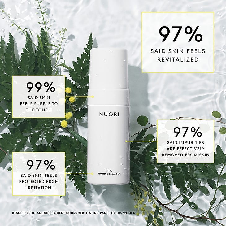 NUORIs Vital Foaming Cleanser er en luksuriøs, cremet ansigtsvask, der omhyggeligt fjerner snavs og makeup uden af fratage huden dens naturlige olier.