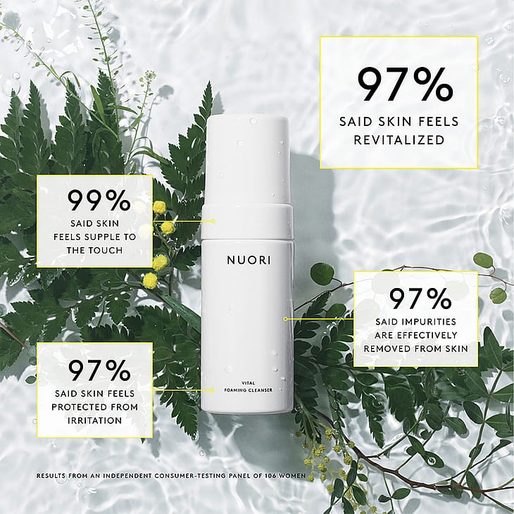 NUORIs Vital Foaming Cleanser er en luksuriøs, cremet ansigtsvask, der omhyggeligt fjerner snavs og makeup uden af fratage huden dens naturlige olier.