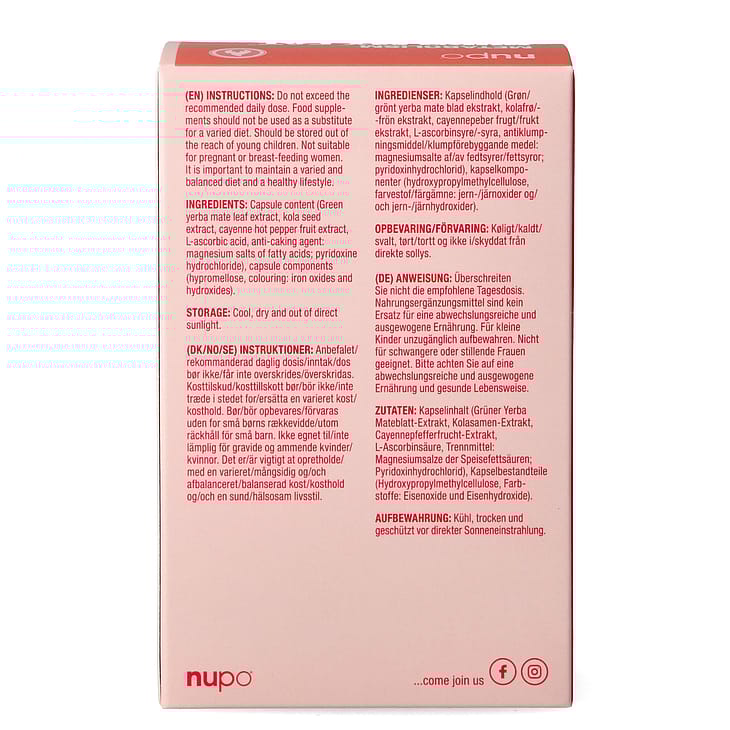 YERBA MATE – kendt som urten ”sendt fra guderne” og producerer selv koffein. Yerba Mate urtens egenskaber bidrager til vægtkontrol og nedbrydning af fedt.KOLANØD – stammer fra vestafrikanske tropiske regnskove og er en naturlig kilde til koffein. Støtter vægttab og fremmer fedtforbrændingen.CAYENNEPEBER – tilhører chilipeberfamilien.