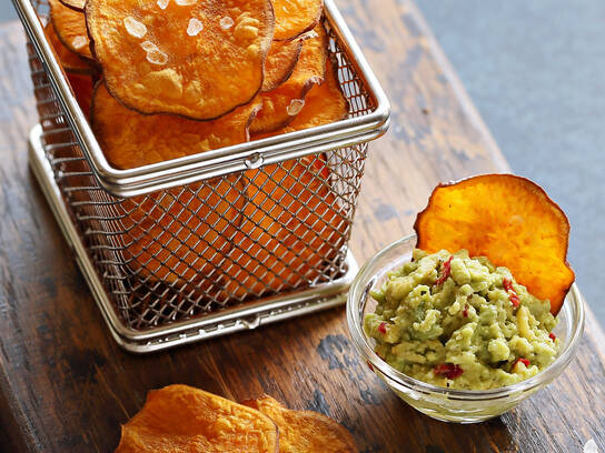 Tænd ovnen på 225 grader, og kom bagepapir på to bageplader. Vask de søde kartofler grundigt, og skær dem i så tynde skiver som muligt med en meget skarp kniv. Fordel kartoffelskiverne på to bageplader, og pensl dem med olivenolie.