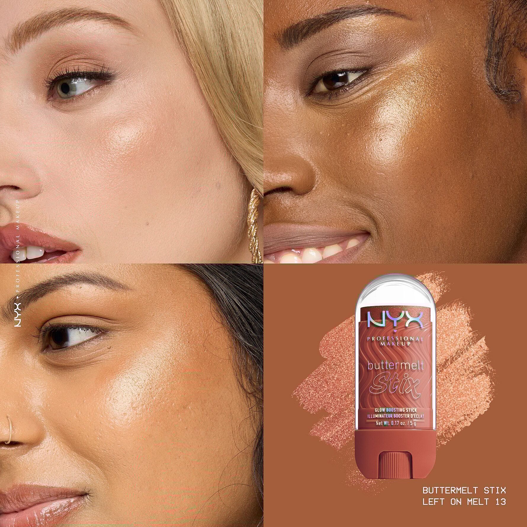 NYX Professional Makeup Buttermelt Glow Boosting Highlighter Stix er en highlighter der er blød som smør, så du kan stråle fra top til tå. Denne stix er beriget med nærende Cupuaçu- og kokossmør som giver en fugtgivende base for en nem, cremet påføring som lægger sig smukt på din hud.