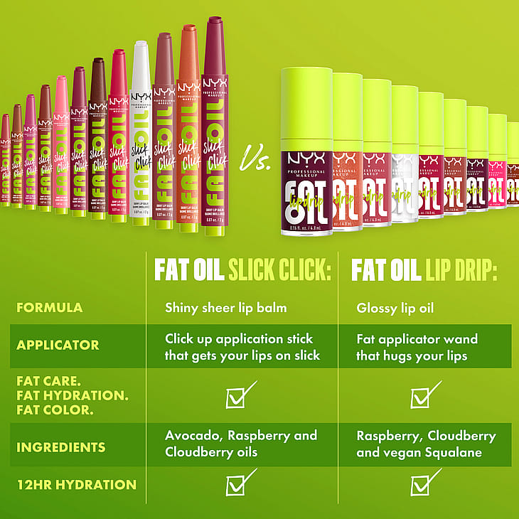 Bløde læber med blot 1 klik. NYX Professional Makeup Fat Oil Slick Click er en pigmenteret læbebalsam som med kun ét klik giver præcis den rette mængde til dine læber. Få et boost af pleje med denne veganske formel* som er beriget med avocado-, multebær- og hindbærolie.