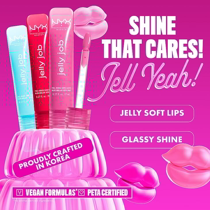 GELÉ-BLØDE LÆBER & GLASLIGNENDE GLANS. Glans som plejer! Få fyldig, skinnende læber med NYX Professional Makeup Jelly Job, som med stolthed er produceret i Korea.