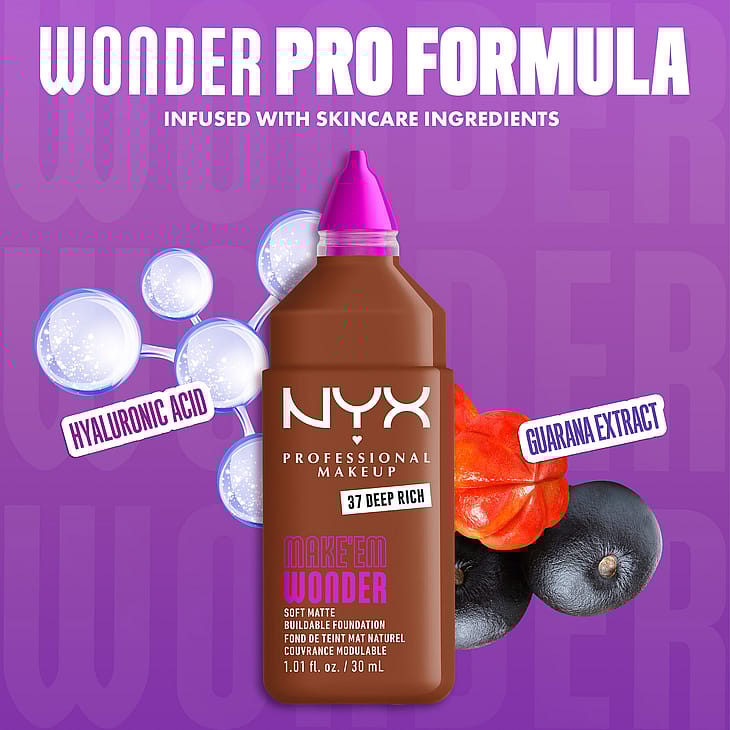 MAKE 'EM WONDER om det er foundation eller om det virkelig er din egen hud med denne bløde, matte og opbyggelige formel.NYX Professional Makeup Make'em Wonder foundation er beriget med hudplejeingredienser, dækker alt men føles stadig vægtløs på din hud.