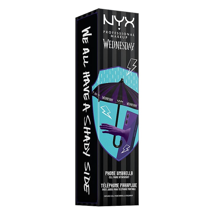 Mobilpynt inspireret af Wednesdays ikoniske, lilla paraply - et praktisk tilbehør med kant. Endelig findes der en måde at tilføje lidt melankolsk glamour til dit udstyr og samtidig beskytte din skærm fra den hårde virkelighed: solskin, regn eller dårligt lys.