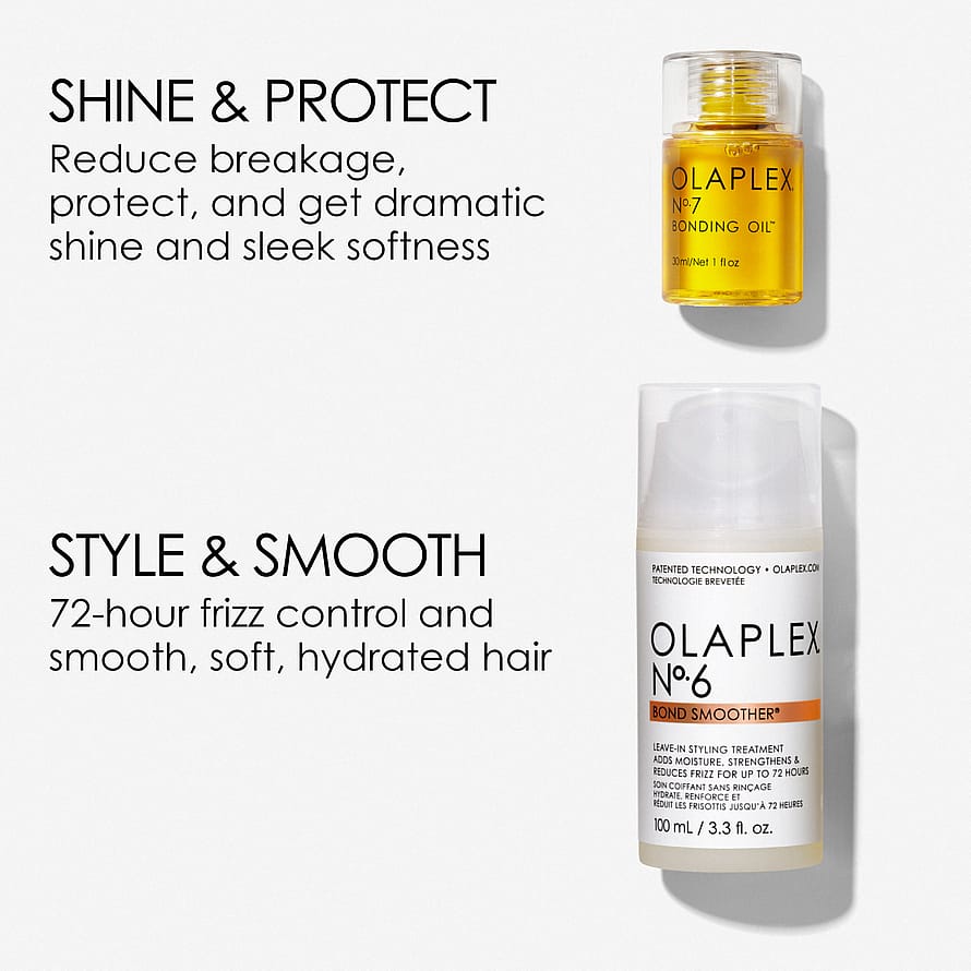 En udglattende og glansforbedrende stylingduo, der består af Olaplex bestsellers - nr. 6 Bond Smoother® og nr. 7 Bonding Oil™, der arbejder sammen om at bekæmpe krus og tegn på skader, i alle hårtyper.