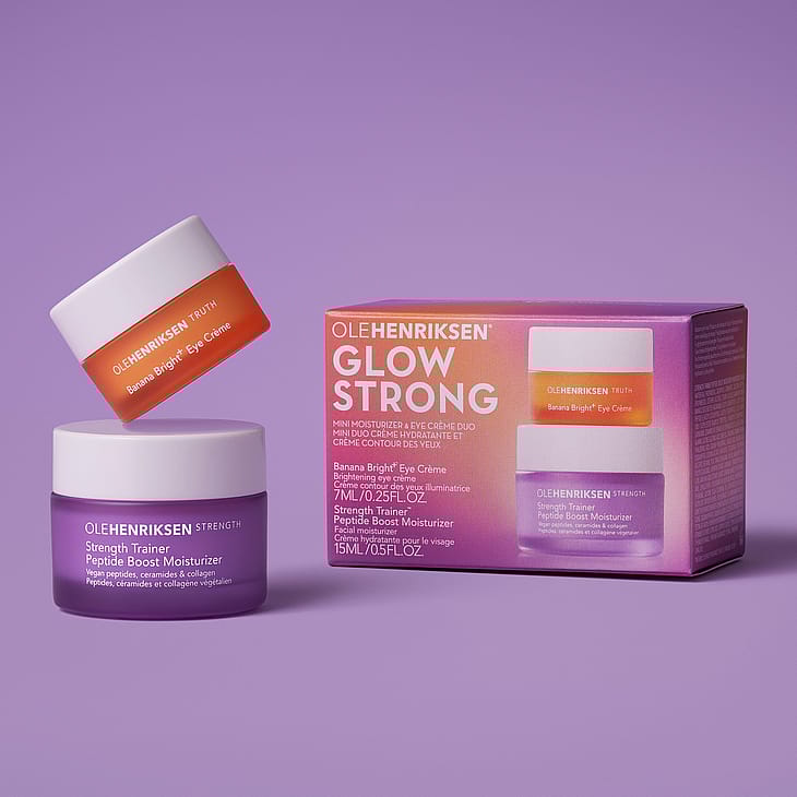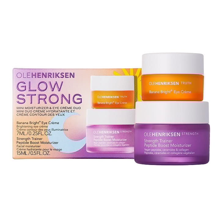 Strength Trainer Peptide Boost Moisturizer: Aqua/Water/Eau, Propanediol, Dicaprylyl Carbonate, Glycerin, Methylpropanediol, Cetearyl Alcohol, Stearyl Alcohol, Mangifera Indica (Mango) Seed Butter, Niacinamide, Acetyl Hexapeptide-1, Acetyl Hexapeptide-8, Acetyl Octapeptide-3, Acetyl Tetrapeptide-2, Acetyl Dipeptide-1 Cetyl Ester, Palmitoyl Tripeptide-1, Palmitoyl Tetrapeptide-7, Carnosine, Ceramide Np, Ceramide Ap, Ceramide Eop, Collagen, Serine, Alanine, Glycine, Glutamic Acid, Lysine Hcl, Threonine, Arginine, Proline, Hyaluronic Acid, Sodium Hyaluronate, Linoleic Acid, Linolenic Acid, Sodium Pca, Sodium Lactate, Panthenol, Tocopherol, Tocopheryl Acetate, Betaine, Pca, Cyanocobalamin, Xylitol, Anhydroxylitol, Xylitylglucoside, Sorbitan Olivate, Carbomer, Hydroxyethylcellulose, Xanthan Gum, Cetearyl Olivate, Sorbitan Laurate, Phytosphingosine, Cholesterol, Polysorbate 60, Butylene Glycol, Hydroxyacetophenone, Glycine Soja(Soybean) Oil, Acrylates/C10-30 Alkyl Acrylate Crosspolymer, Polysorbate 20, Ammonium Acryloyldimethyltaurate/Beheneth-25 Methacrylate Crosspolymer, Dimethicone, Sodium Phytate, Sodium Lauroyl Lactylate, Pentaerythrityl Tetra-Di-T-Butyl Hydroxyhydrocinnamate, Leuconostoc/Radish Root Ferment Filtrate, Citric Acid, Caprylyl Glycol, Ethylhexylglycerin, Phenoxyethanol, Parfum/Fragrance*, Citral, Limonene, Linalool.*Naturally Derived Fragrance Per Iso Standard 16128-1Banana Bright+ Eye Crã¨Me: Aqua/Water/Eau, Simmondsia Chinensis (Jojoba) Seed Oil, Butyrospermum Parkii (Shea) Butter, Isododecane, Coconut Alkanes, 3-O-Ethyl Ascorbic Acid, Cetearyl Alcohol, Glycerin, Synthetic Beeswax, Dilinoleic Acid/Propanediol Copolymer, Polymethylsilsesquioxane, Cocoyl Proline, Dimethicone Crosspolymer, Pentaerythrityl Tetraisostearate, Tetrahexyldecyl Ascorbate, Ascorbic Acid, Colloidal Gold, Collagen, Glutathione, Citrus Nobilis (Mandarin Orange) Fruit Extract, Citrus Paradisi (Grapefruit) Peel Extract, Glucosyl Hesperidin, Tocopherol, Tamarindus Indica Seed Polysaccharide, Poncirus Trifoliata Fruit Extract, Morus Alba Root Extract, Linoleic Acid, Linolenic Acid, Jojoba Esters, Caprylyl Glycol, Coco-Caprylate/Caprate, Propanediol, Polyglyceryl-3 Cocoate, Polyglyceryl-4 Caprate, Polyglyceryl-6 Caprylate, Polyglyceryl-6 Ricinoleate, Hdi/Trimethylol Hexyllactone Crosspolymer, Polyacrylate-13, Butylene Glycol, Polyglyceryl-3 Stearate, Polysorbate 20, Sodium Citrate, Polyisobutene, Beheneth-5, Acrylates/C10-30 Alkyl Acrylate Crosspolymer, Behenyl Alcohol, Sodium Hydroxide, Sorbic Acid, Sorbitan Isostearate, Citric Acid, Sorbitol, Silica, Sodium Benzoate, 1, 2-Hexanediol, Xanthan Gum,
