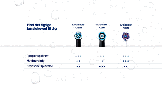 Efter 6 års forskning og over 250 patenter, ankommer Oral-B iO™ eltandbørste - en førsteklasses børsteoplevelse som tilbyder den mest grundige, nænsomme og lydsvage rensning nogensinde. Oplev en grundig samt nænsom børsteoplevelse med den nye revolutionerende magnetisk iO-teknologi. De runde børstehoveder er inspireret af tandlæger, og kombineret med de mikrovibrerende børstehår, sikrer det dig en frisk og ren mundfølelse. Resultaterne er Oral-B’s bedste rengøring nogensinde – 6x mere effektiv til at fjerne plak langs tandkødet og 100% friskere tandkød indenfor én uge. Du vil både kunne se, høre og mærke forskellen når du går fra en elektrisk tandbørste til iO.