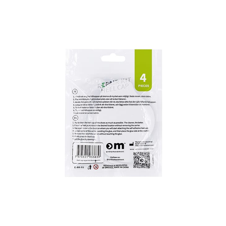Dette kit inkluderer fire par selvklæbende hælkapsler, der nemt reparerer slidte hæle og giver dine sko nyt liv.