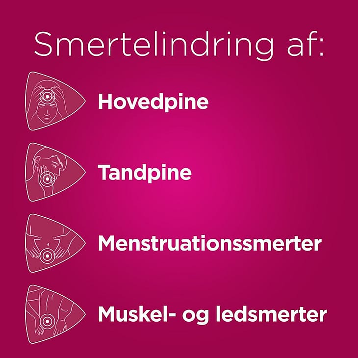 Anvendelse: Mod svage smerter f.eks. hovedpine, menstruationssmerter, tandpine, muskel- og ledsmerter, samt for at nedsætte feber f.eks. ved forkølelse og influenza.