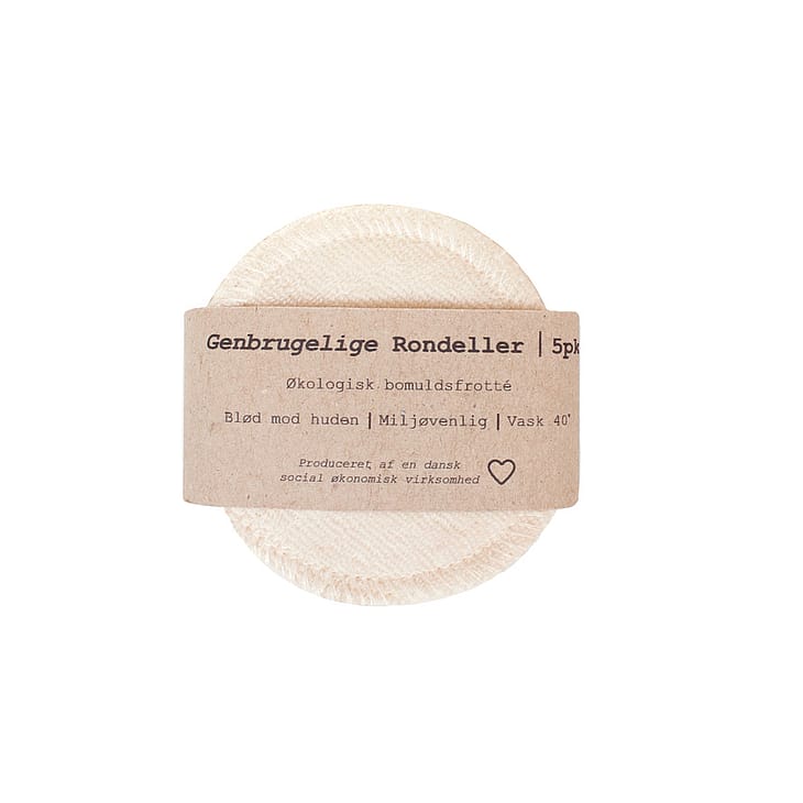 5 stk genbrugelige rondeller - naturhvid/ublegede De genbrugelige rondeller er produceret af en økologisk bomuldsfrotté der er meget blød mod huden og derfor velegnet til sensitiv hud. Rondellerne kan bruges med vand, micellar vand eller ethvert andet renseprodukt. Det er en meget mild måde at rense huden på og fjerner effektivt makeup med en let eksfolierende effekt. Rondellerne er sammensat af 2 lag stof og du kan derfor nøjes med at bruge 1 om dagen eller skylle den og genbruge den over flere dage. Pargaards rondeller er vaskbare og vi anbefaler at vaske dem på 30/40 grader, men de kan også vaskes på 60 grader. Alle rondeller bliver syet i Danmark hos social økonomiske virksomheder der arbejder for at beskæftige både unge og ældre borgere. Disse social økonomiske virksomheder arbejder for at mennesker på kanten af arbejdsmarkedet kan udvikle kompetencer, samtidig med at deres værdighed og værdi bliver anerkendt. Pargaard gør sit absolut bedste for at skabe produkter der gør det lettere at leve et miljøvenligt liv. Vi bestræber os på at undgå plastik, kemikalier mm. som er skadende for vores planet. Derfor er produkternes emballage produceret af genanvendte materialer. Pargaards Tips: - Hvis du fx bruger micellar rens, kan du med fordel gøre rondellerne lidt våde, inden du kommer rens på, for at spare på dit produkt. - Rondellerne er gode til afrensning af masker. - Brug dem om morgenen til at minimere hævede og trætte øjne - hæld meget koldt vand på 2 rondeller og tryk dem forsigtigt ned over hvert øje og lad dem sidde i 5 min imens du slapper af.