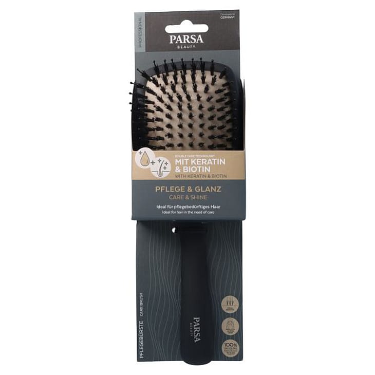 Keratin- og biotinplejebørsten fra PARSA Beauty giver dit hår en synlig glans og smidighed. Med teknologi, der forener effekt og pleje, er denne børste et must-have i din skønhedsrutine. De højkvalitetsnaturbørster er beriget med keratin og biotin, som plejer og glatter håret fra rod til spids. De innovative børster udreder håret skånsomt og forebygger både spaltede spidser og hårbrud, mens hårets kæmbarhed forbedres mærkbart.