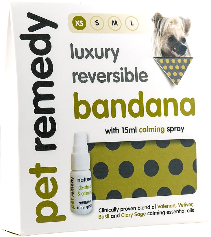 Pet Remedy har lavet en bandana, som er beregnet til at binde rundt om hunden eller kattens hals. Bandanaen er i 2 forskellige farver og er vendbar. Bandanaen er i størrelse x-small fx chihuahua eller katte.
