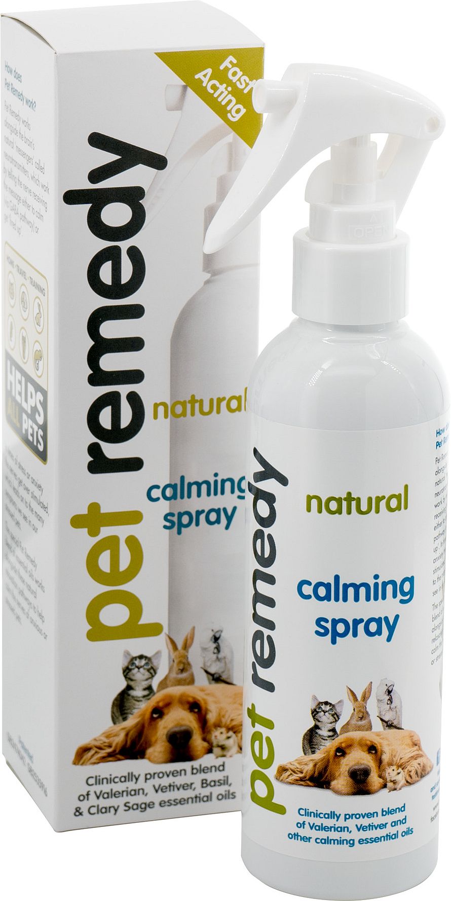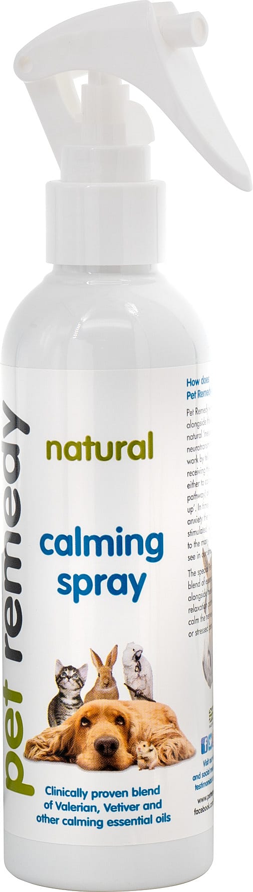 Den unikke blanding af æteriske olier fra Pet Remedy virker beroligende på kæledyr med angst og stress.Olierne virker ved at øge produktionen af et naturligt stof produceret i hjernen hos kæledyr kaldet GABA (gamma-aminobutansyre). Ved for lave værdier af GABA hæmmes overførslen af elektriske impulser mellem nerveceller, som dermed kan føre til stress og angst.Pet Remedy produkterne er en mindre koncentreret baldrianbaseret blanding af olier, der er meget skånsom i sin virkning på stofskifte i ethvert pattedyr, krybdyr eller fugl. Følgende ingredienser findes i de ph-neutrale produkter:Baldrian stammer fra roden af valerianeplanten, Valeriana officinalis. Midlet har i mange tusinde år været brugt som naturmiddel mod søvnløshed, kramper, migræne, gigt, nervøse lidelser og endda ved bedøvelse. I dag er baldrian et godkendt naturlægemiddel mod uro og søvnbesvær. Lægemiddelstyrelsen har gennemgået den europæiske og amerikanske litteratur, der findes om planten, og givet grønt lys for, at midlet har en virkning mod lette symptomer på uro og søvnbesvær, som man normalt ikke ville søge læge for.Vetiver (Chrysopogon zizanioides) er et hårdt, aromatisk græs, og den æteriske olie udvindes ved dampdestillation af rødderne i dette græs, der hører til den samme botaniske familie som citrongræs, citronella og palmarosa. Denne plante er blevet værdsat for sine beroligende egenskaber, siden de første registreringer. Det ekstraheres fra de vaskede, hakkede, tørrede og gennemblødte rødder og rodnet ved dampdestillation. Aromaen er meget jordagtig. De vigtigste kemiske komponenter er benzoesyre, vetiverol, furfurol, a og b-vetivon, vetivene og vetivenylvetivenat. Vetiver hentes hjem fra Haiti og Java.Sød basilikum (Ocimum basilicum) er en aromatisk urt med frodige grønne blade. Den essentielle olie ekstraheres ved dampdestillation af bladene. Sød basilikum-essentiel olie har forskellige kemiske forbindelser, der inkluderer a-pinen, camphen, b-pinene, myrcen, limonen, cis-ocimene, kamfer, linalool, methylchavicol, y-terpineol, citronellol, geraniol, methylcinnamat og eugenol. Det bruges ofte i aromaterapi for dets beroligende virkning. Sød Basilikum hentes hjem fra Europa og Egypten.Clary Sage (Salvia Sclaria) er en toårig urt, der er hjemmehørende omkring Middelhavet og dele af Europa. Clary Sage olie ekstraheres ved dampdestillation af knopper og blade fra Clary Sage-planten. Kendte kemiske forbindelser, der er til stede i Clary Sage essentiel olie, inkluderer estere, sesquiterpener, di-terpener og monoterpener. Clary Sage æterisk olie hentes hjem fra Frankrig.