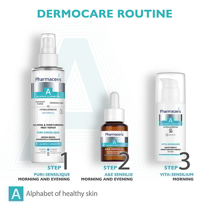 Påfør en lille mængde serum og fordel det på huden med cirkulære bevægelser, vent til det er absorberet. Påfør derefter en passende Pharmaceris A creme.