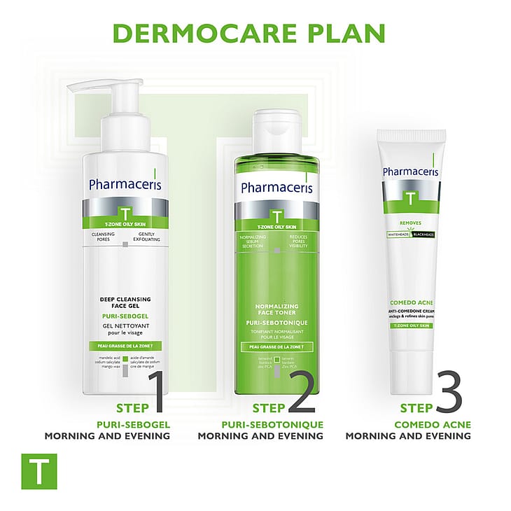 Påfør gelen på fugtig hud og rens dit ansigt ved hjælp af cirkulære bevægelser, undgå området omkring øjnene, og skyl efter med rent vand. Brug efterfølgende en passende ansigtstonic og creme fra Pharmaceris T serien. Bruges dagligt om morgenen og ved sengetid.