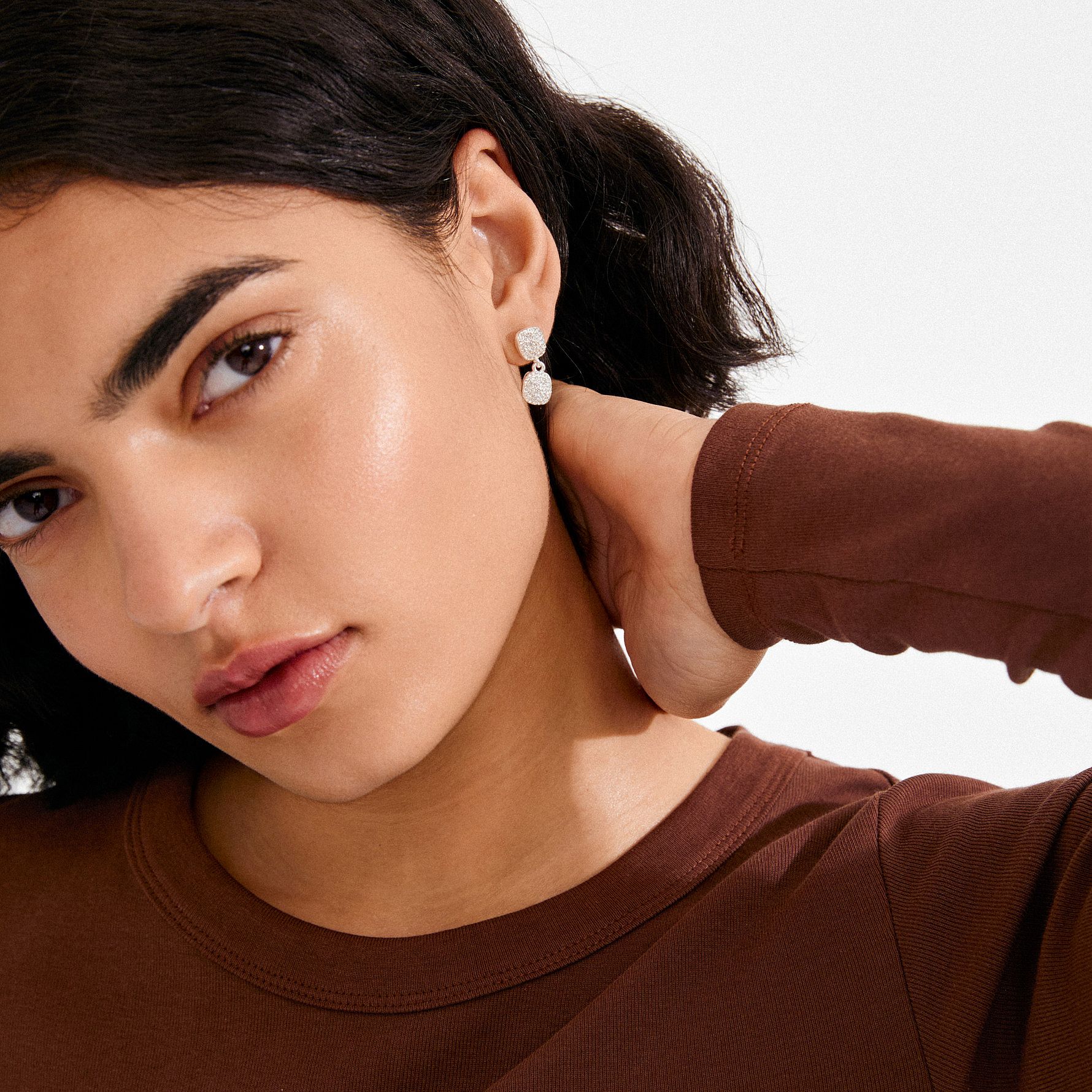 EMBER-øreringene fra Pilgrim sætter glow og classiness i fokus med en firkantet ørestik og et bevægeligt vedhæng – begge dækket af funklende Preciosa-krystaller.