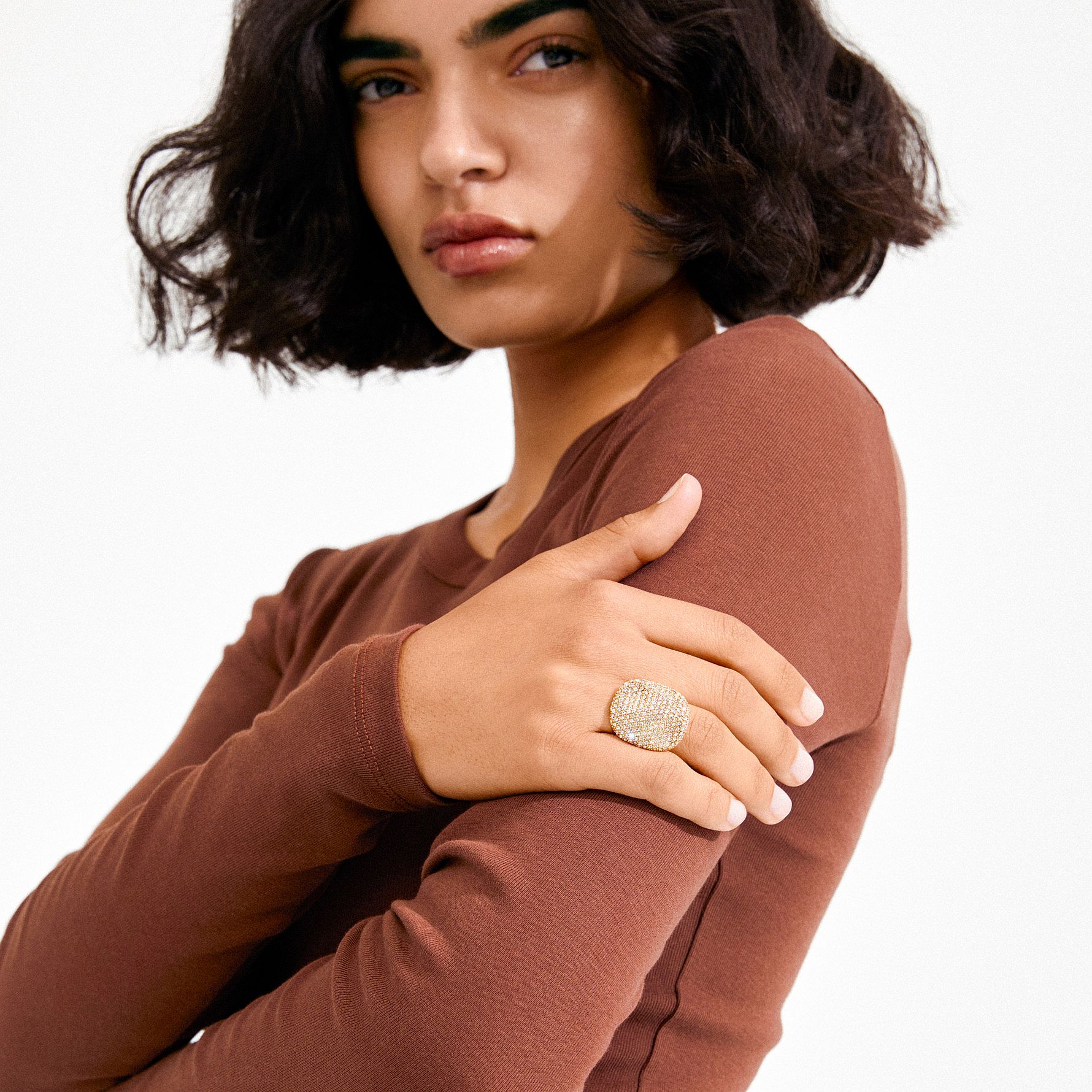 EMBER-ringen fra Pilgrim er dit go-to glam piece, når dit look skal have ekstra glow. Den guldbelagte ring har en stor, kvadratisk deco med en unik organisk formet overflade, dækket af funklende Preciosa-krystaller.
