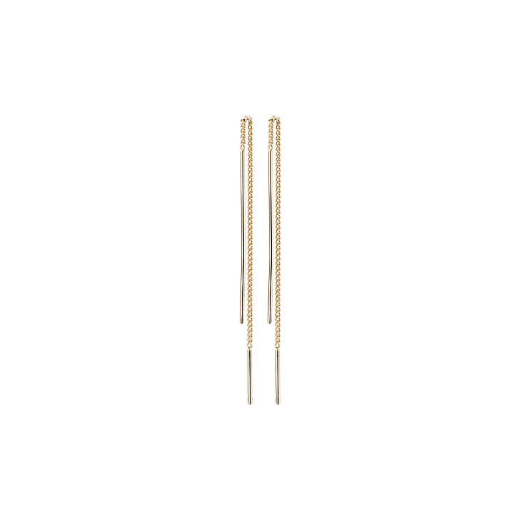 Versatile vibes! De guldbelagte TAHOE kæde-øreringe er både trendy og alsidige. Det unikke design, der kombinerer en spinkel stav og kæde, kan styles på flere måder, alt efter hvor mange huller du har langs kanten af dit øre. Perfekte til at skabe et personligt ear curation look – prøv at kombinere dem med små hoops for et edgy touch.