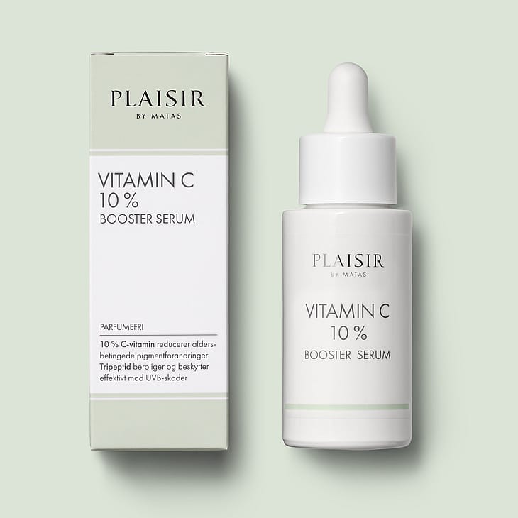 - 10% C-vitamin reducerer aldersbetingede pigmentforandringer, forebygger uren hud og beskytter mod frie radikaler fra UVA-stråler