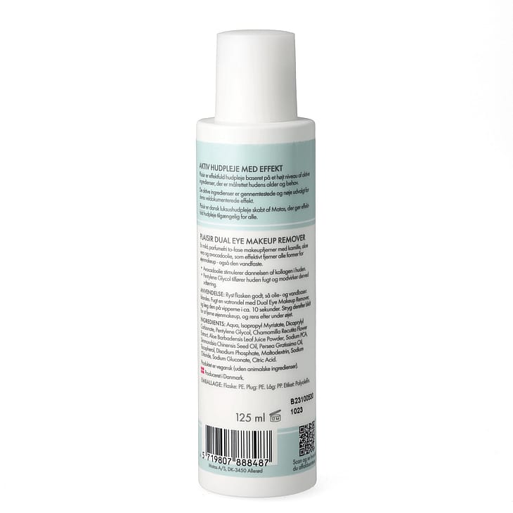 Plaisir Dual Eye Makeup Remover er en mild, parfumefri to-fase makeupfjerner med kamille, aloe vera og avocadoolie.