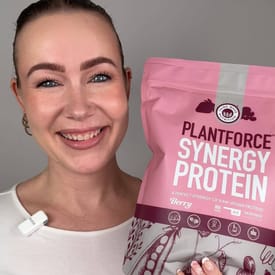 Plantforce Synergy Protein giver dig 100 % vegansk proteinpulver med kombinerede proteinkilder fra ærter, brune ris og græskar.