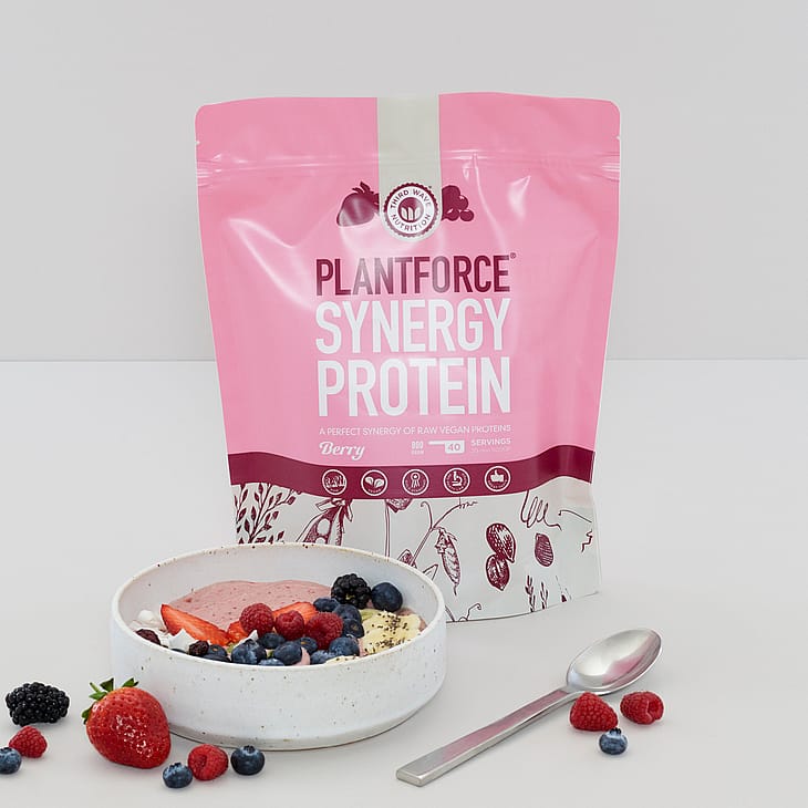 Plantforce Synergy Protein er et lækkert plantebaseret proteinpulver lavet af græskarprotein, ærteprotein og brune risproteiner. Kan anvendes af alle. Perfekt til dig som søger et vegansk proteinpulver der er velsmagende og har et højt proteinindhold.