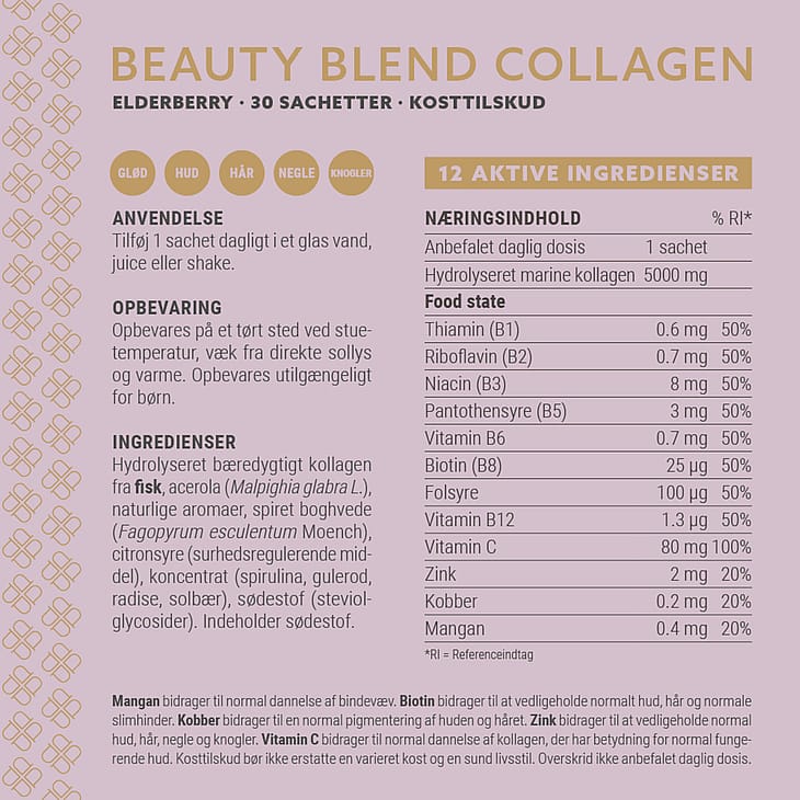Alle vores Beauty Blend Collagen varianter indeholder Food state B Complex bestående af B1, B2, B3, B5, B6, Biotin og B12. Derudover Vitamin C fra acerola, Folsyre, Zink, Kobber og Mangan.