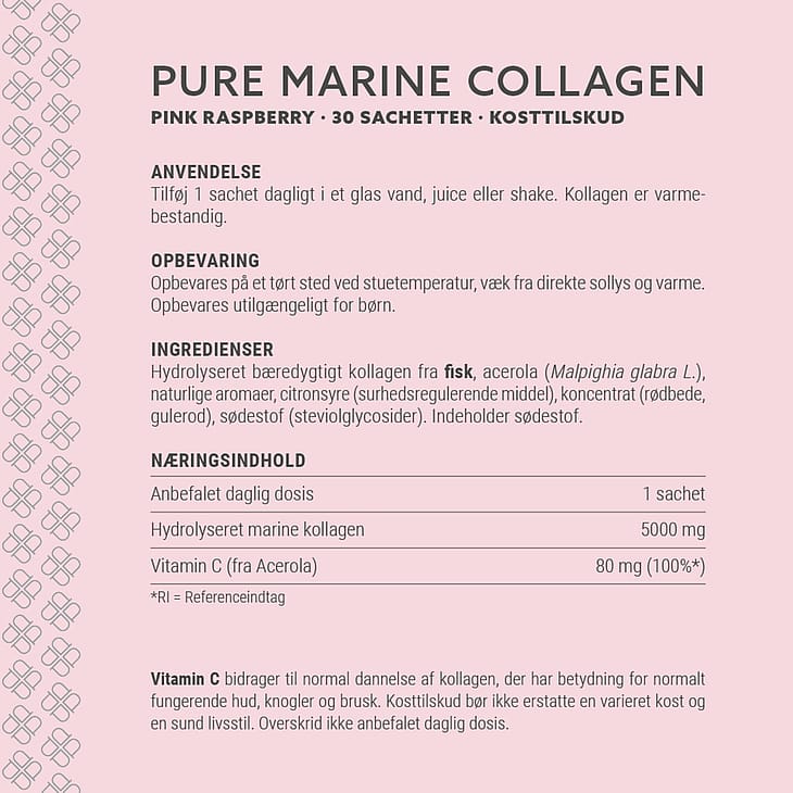 Næringsindhold pr. daglig dosis (1 sachet)| Hydrolyseret marine kollagen | 5000 mg |