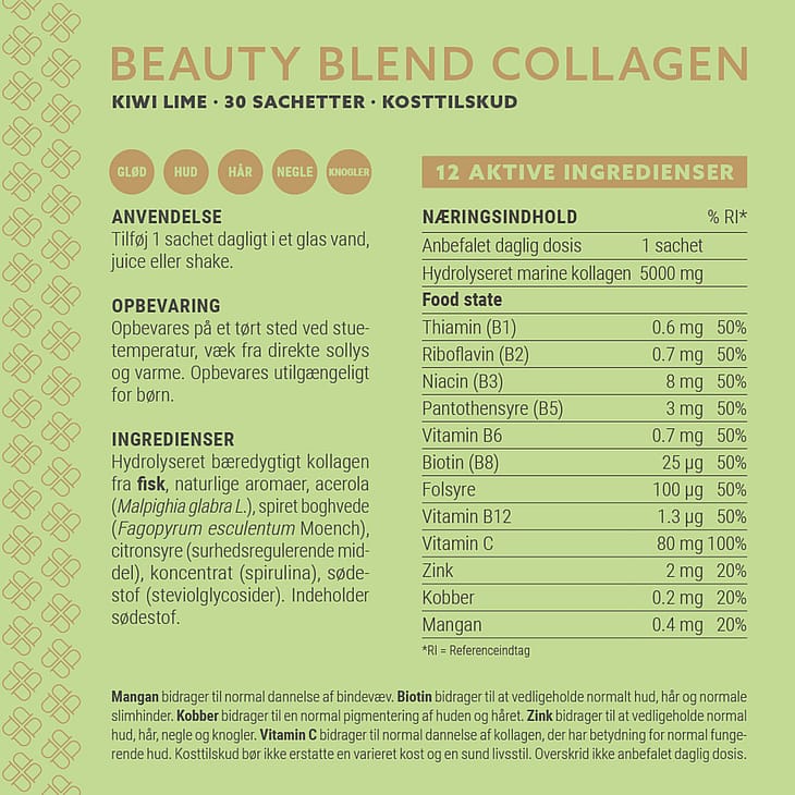 Alle vores Beauty Blend Collagen varianter indeholder Food state B Complex bestående af B1, B2, B3, B5, B6, Biotin og B12. Derudover Vitamin C fra acerola, Folsyre, Zink, Kobber og Mangan.