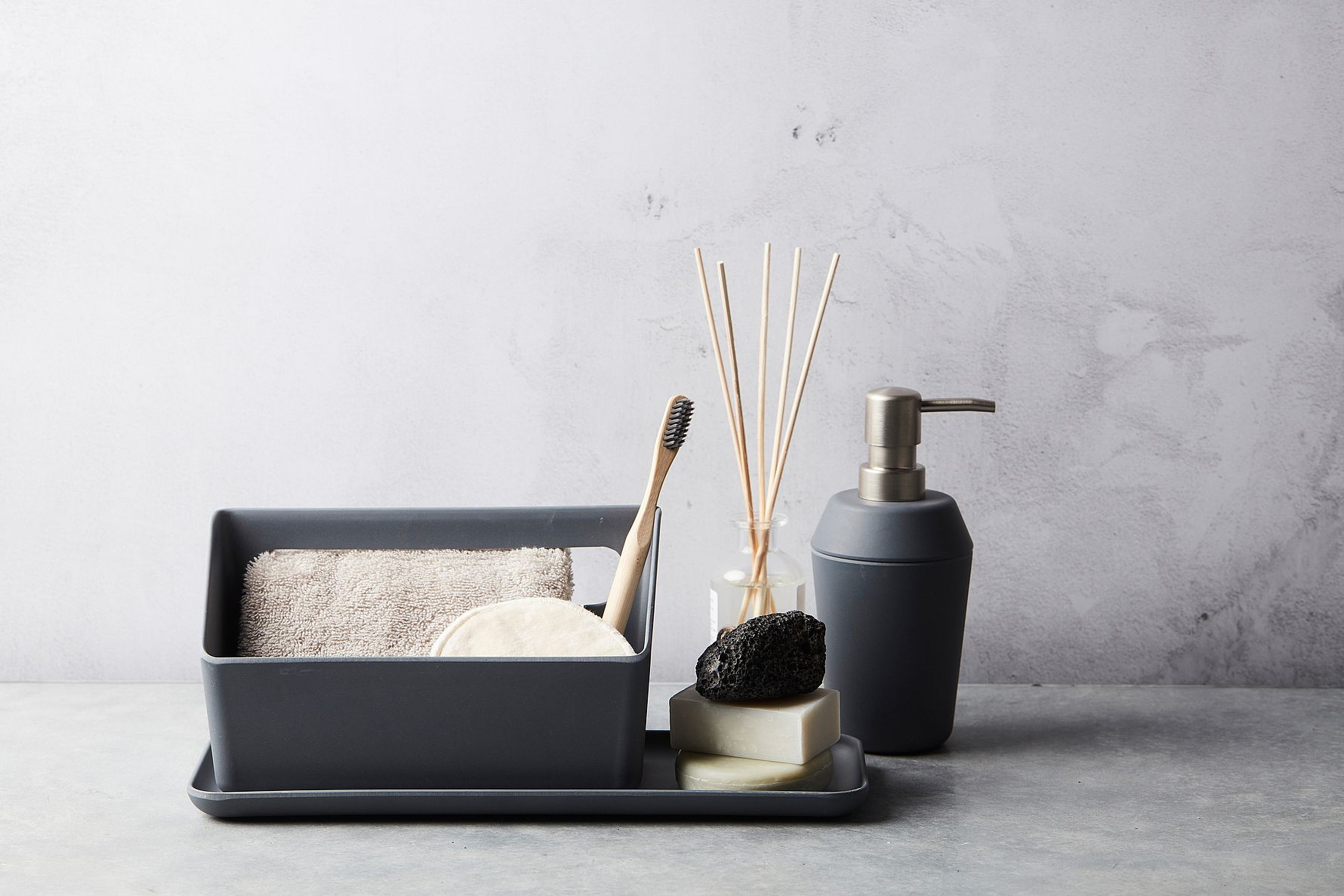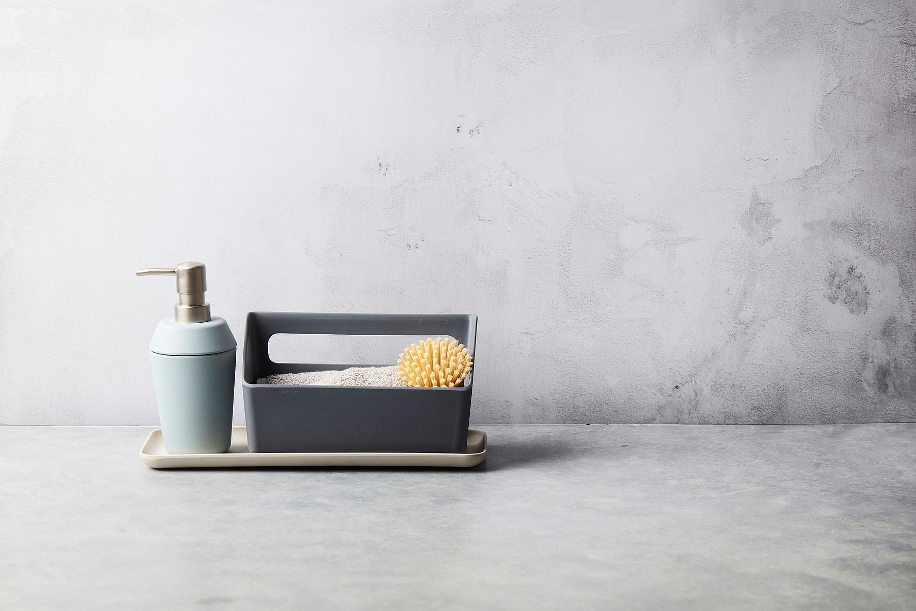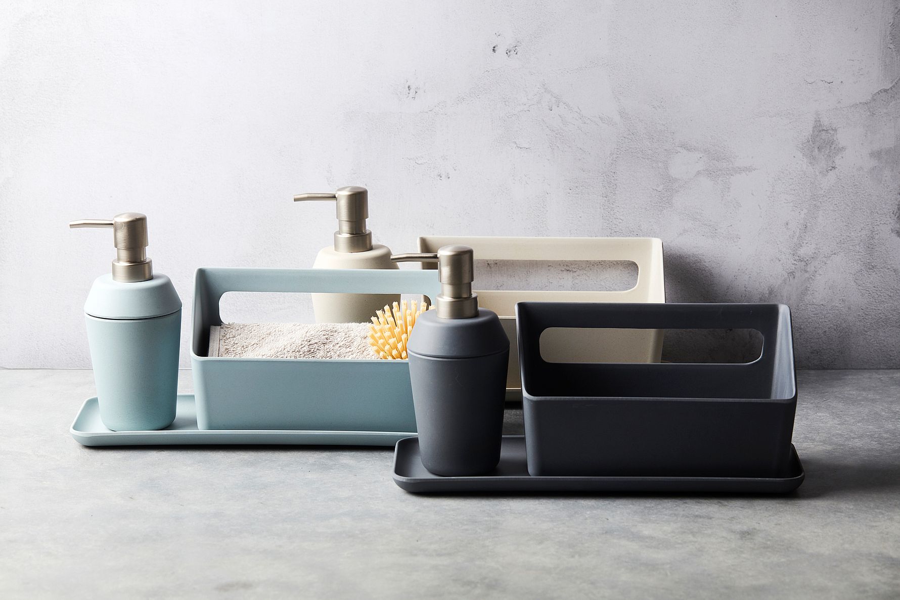 Sofistikeret opbevaring til køkkenvasken i en mørk, mat nuance.
