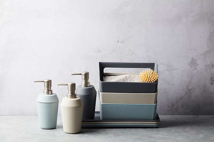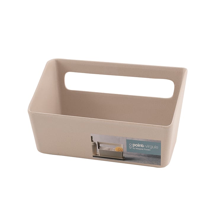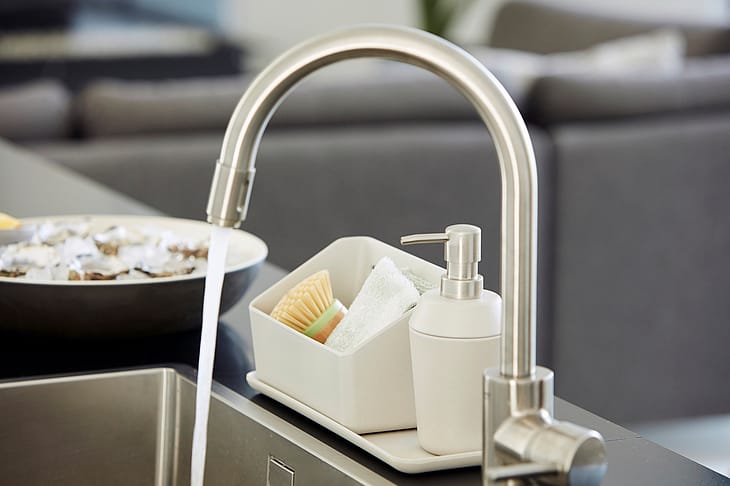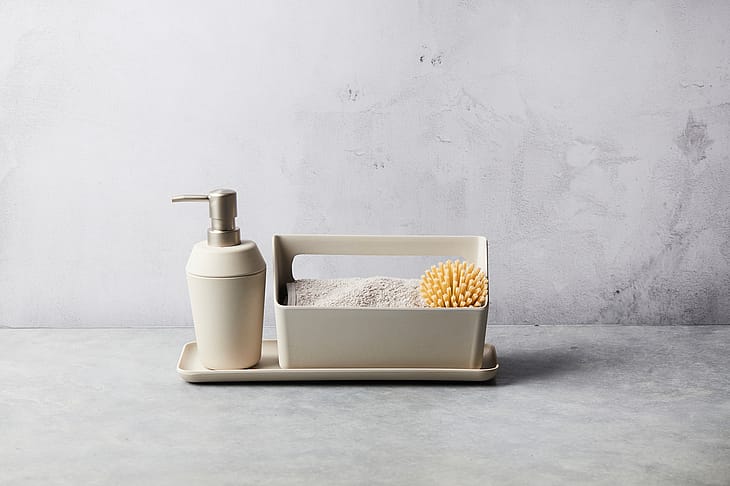 Elegant og funktionel holder til opvaskebørste, klud og sæbe.