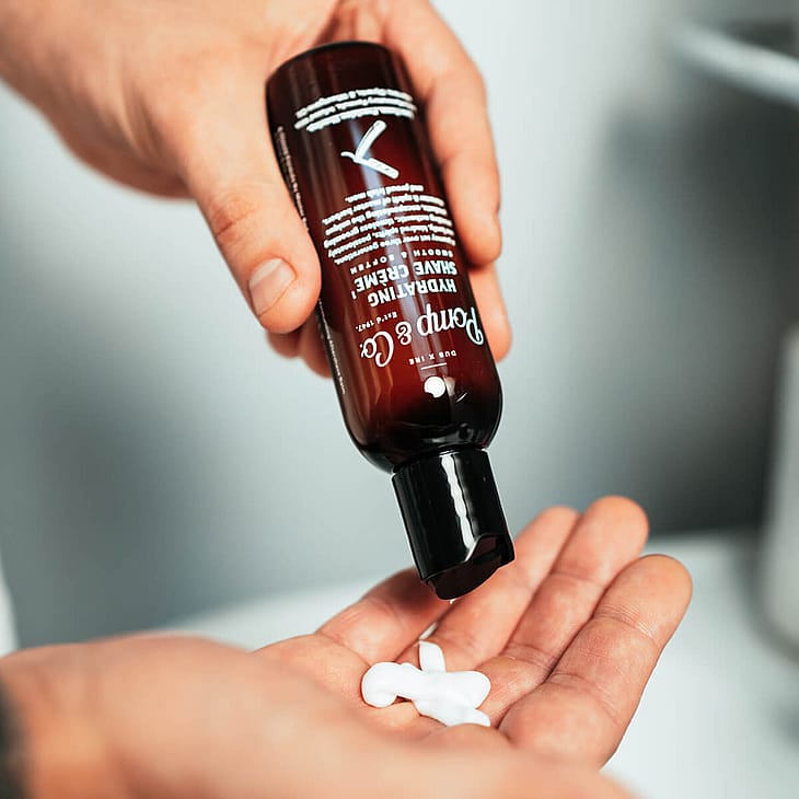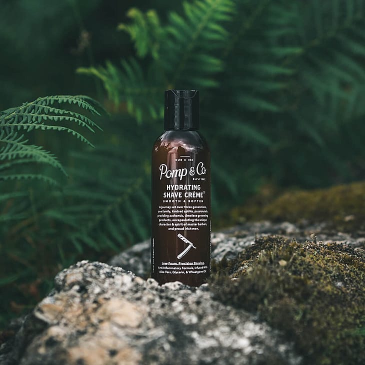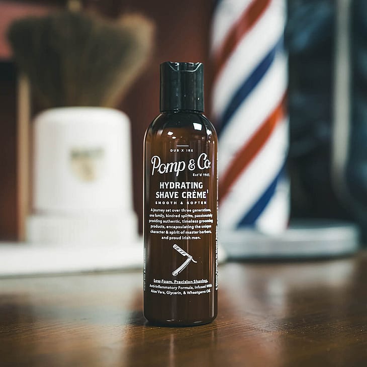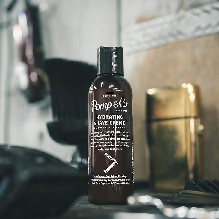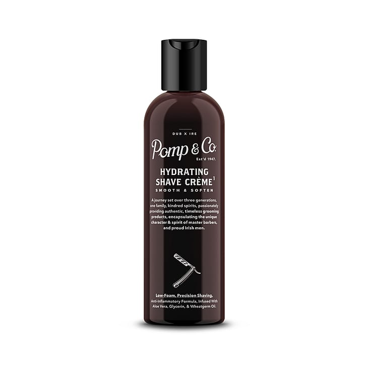 Pomp & Co's Hydrating Shave Crème er skabt med omhu og indeholder nøje udvalgte ingredienser, herunder antiinflammatorisk aloe vera, fugtgivende glycerin og nærende hvedekimolie for en skånsom barbering.