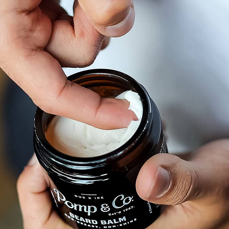 Beard Balm fra Pomp & Co. er hvid i farven med en blød og cremet tekstur.