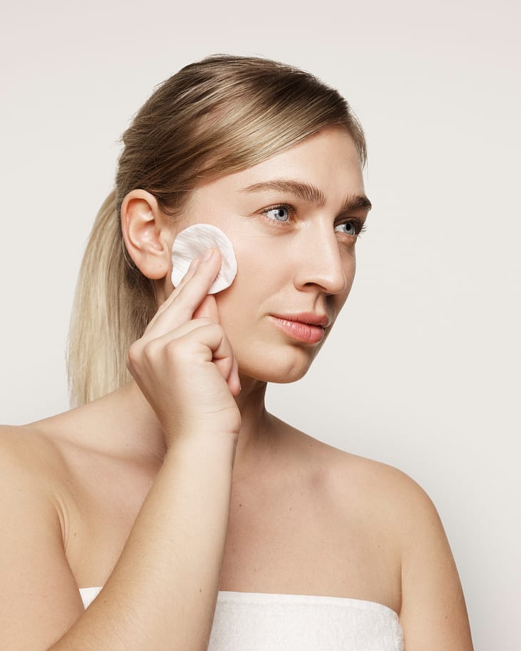 Påfør Cleansing Water på en vatrondel og rens derefter ansigtet med lette stryg.
