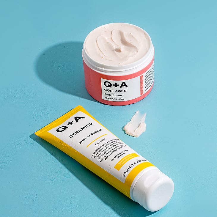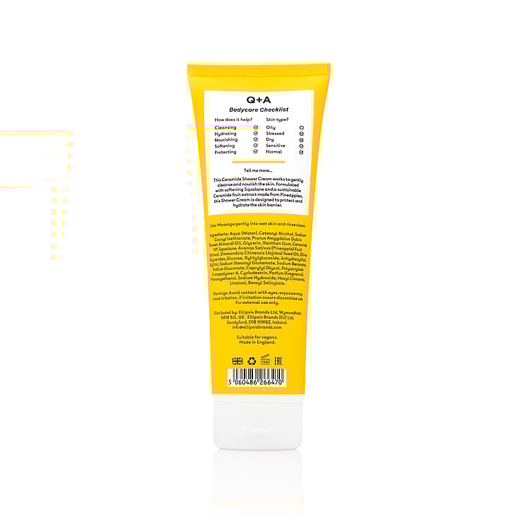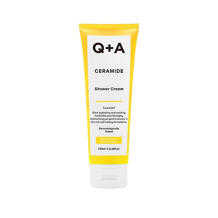 Ceramide Shower Cream fra Q+A er en brusecreme med ceramider, der er ultra-hydrerende og skånsomt renser huden med en rig og cremet formel.