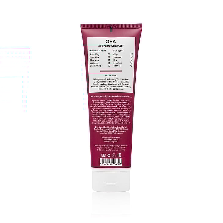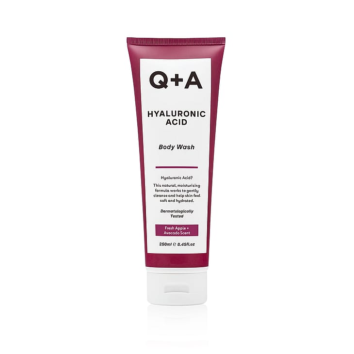 Hyaluronic Acid Body Wash fra Q+A er en kropssæbe med hyaluronsyre, der skånsomt renser og fugter huden.