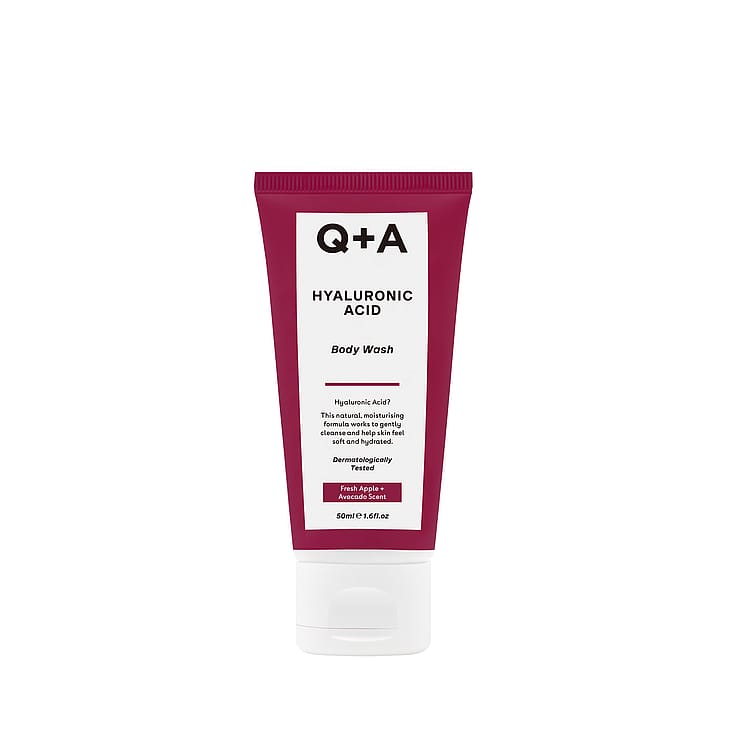 Hyaluronic Acid Body Wash Travel Size fra Q+A er en kropssæbe i en rejsevenlig størrelse (50 ml), med hyaluronsyre, der skånsomt renser og fugter huden.
