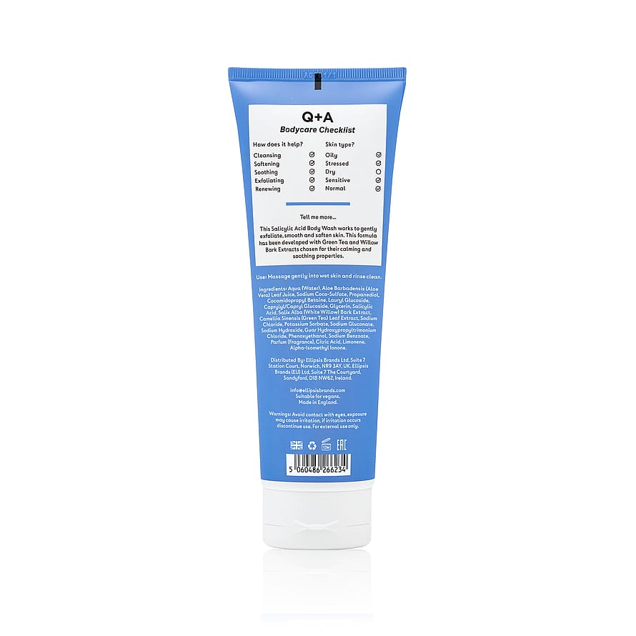 Salicylic Acid Body Wash fra Q+A er en kropssæbe med salicylsyre, der skånsomt eksfolierer, udglatter og blødgør huden.